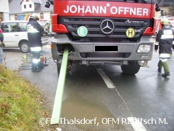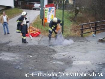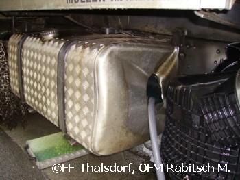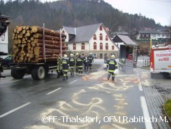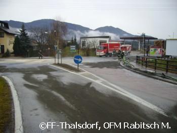 Die alarmierten Feuerwehren Thalsdorf und St.Veit mussten weiteren ?laustritt verhindern und auf einer Fl?che von ca. 100m? eine stattliche Anzahl von Bindemittel ausbringen. Auch der Landeschemiker musste hinzugezogen werden.