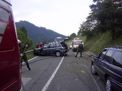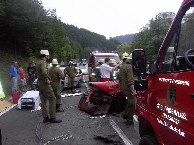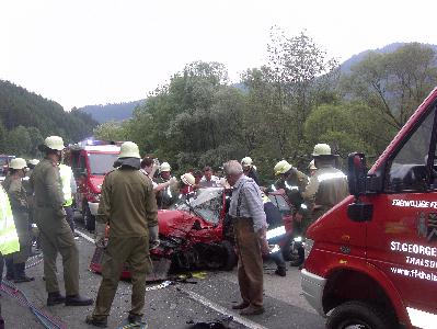 Insgesamt waren an dem Unfall drei Fahrzeuge beteiligt. Mittels schwerem Bergeger?t musste eine schwer verletzte Person aus dem v?llig demolierten Fahrzeug befreit werde, ehe sie dem Notarzt zur Weiterversorgung ?bergeben werden konnte. An dem Einsatz waren drei Feuerwehren der Umgebung beteiligt, die FF-Thalsdorf stand mit 19 Mann im Einsatz.