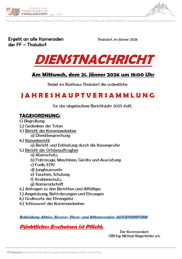 Am 21. Jänner fand die Jahreshauptversammlung der FF-Thalsdorf für das Berichtsjahr 2025 statt.