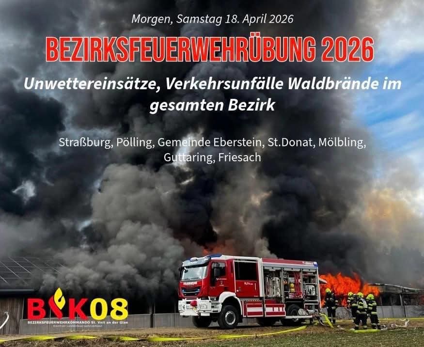 Im Rahmen der Bezirksübung 2026 der Feuerwehren des Bezirkes St. Veit an der Glan standen am 18. April insgesamt 585 Feuerwehrmitglieder mit rund 100 Fahrzeugen bei mehreren realitätsnahen Großschadensszenarien im Übungseinsatz. Die Übung erstreckte sich über den Zeitraum von 6:00 bis 18:00 Uhr.